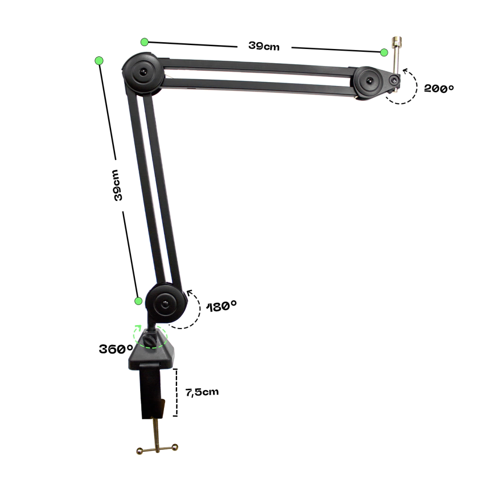 Ao acoplar o braço articulado para microfone na mesa ou bancada, você terá um suporte ajustável e resistente, essencial para o seu trabalho audiovisual, lives e podcasts! Além disso, ele evita cabos soltos ou pendurados, garantindo uma organização impecável para o seu espaço.
