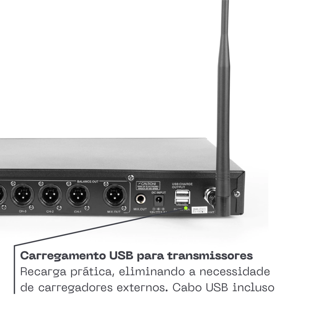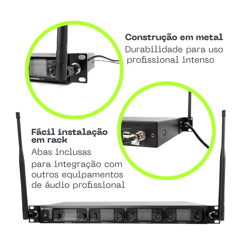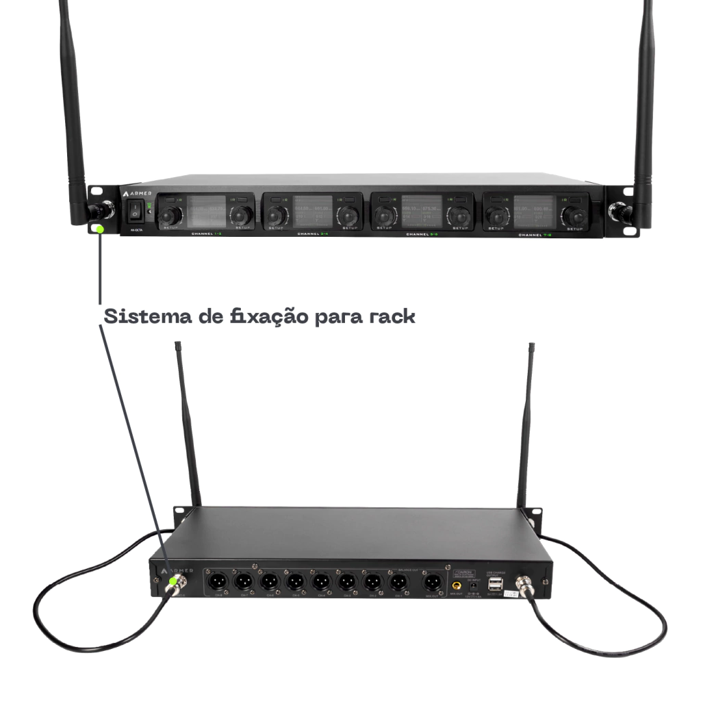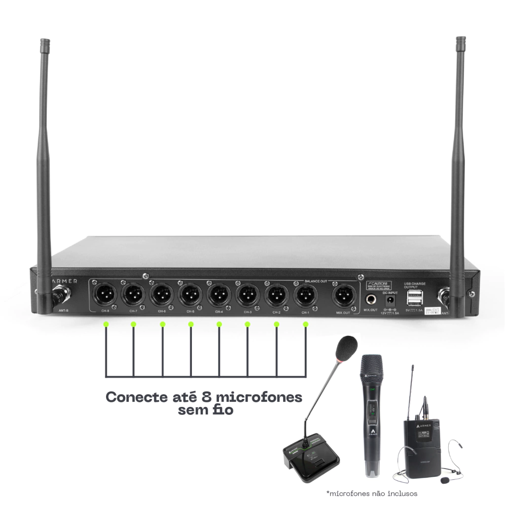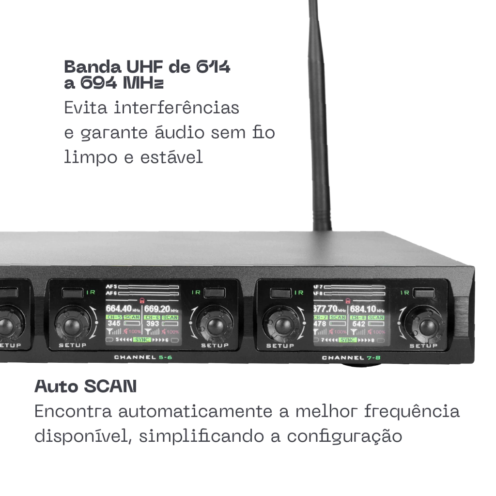 Projetado com tecnologia UHF avançada, o sistema conecta até 8 microfones sem fio simultaneamente, proporcionando flexibilidade, qualidade sonora cristalina e estabilidade de sinal incomparável.