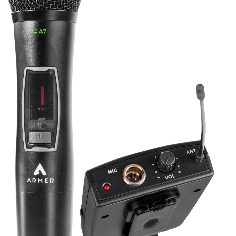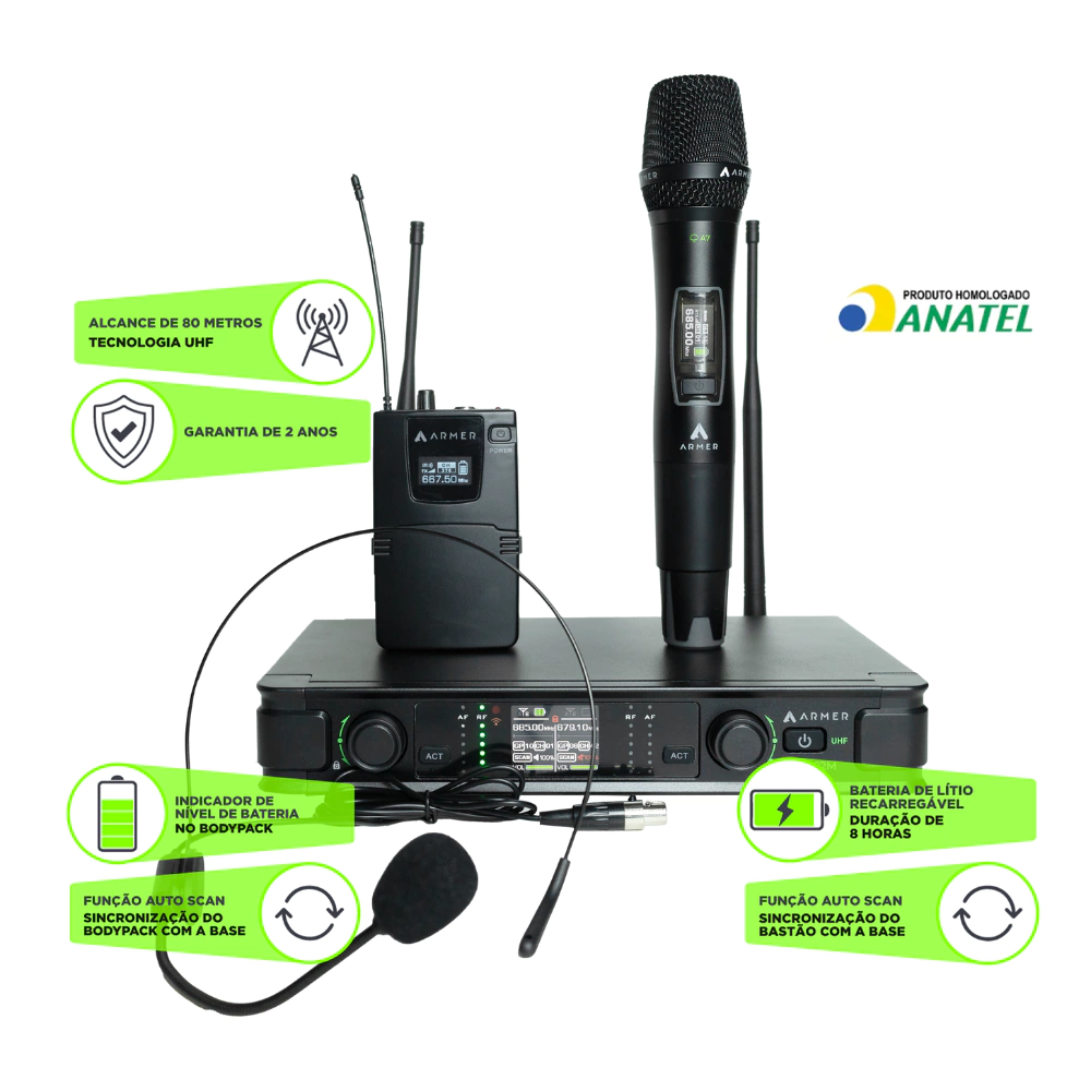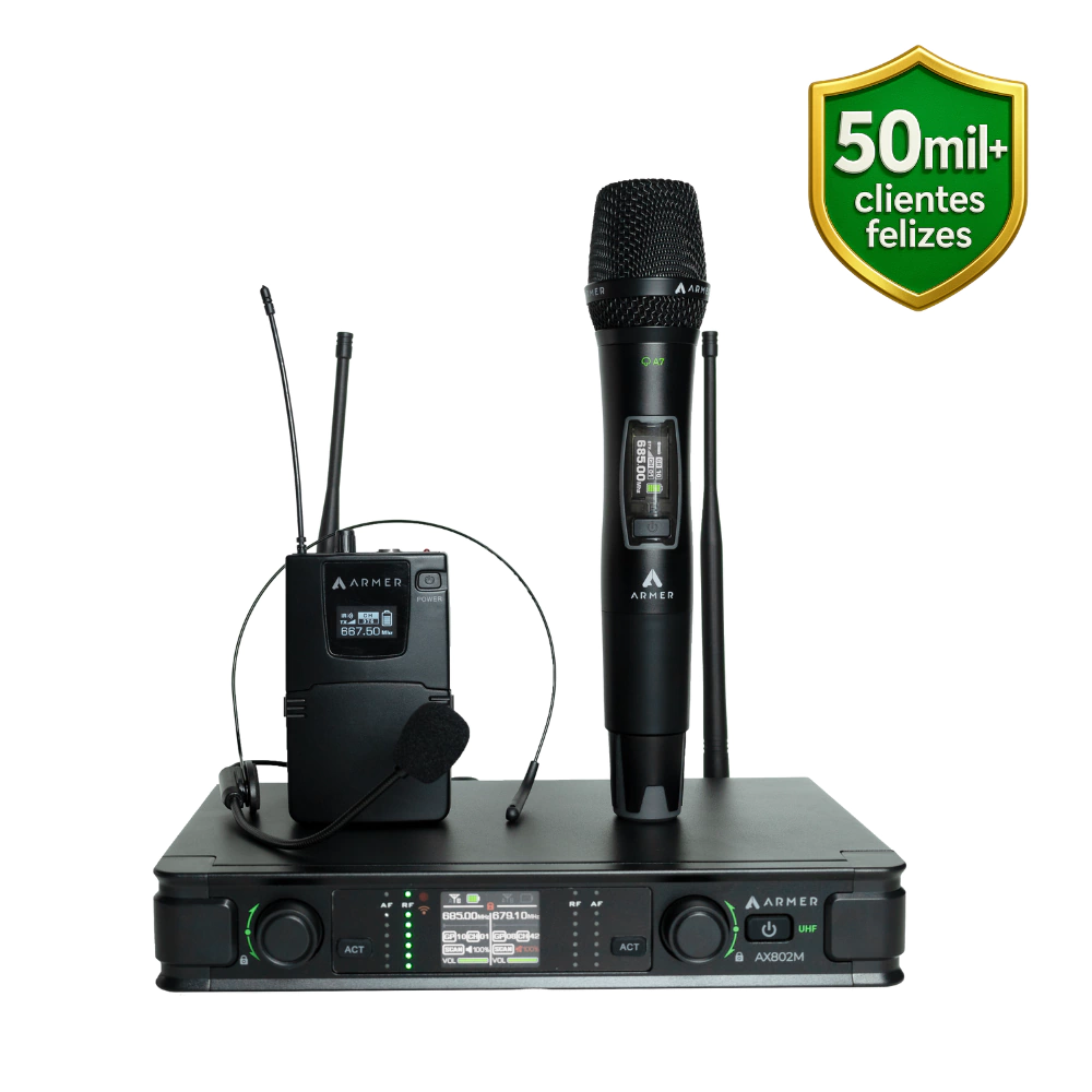 O Microfone sem Fio Profissional Bastão + Headset Uni-Direcional Armer AX802MH é um sistema UHF de alto desempenho, desenvolvido para atender às necessidades de músicos, palestrantes, igrejas, academias, eventos e produções ao vivo. Com um microfone de mão dinâmico e um headset uni-direcional, oferece versatilidade, captação precisa e redução de ruídos indesejados. Seu design ergonômico e funcionalidades avançadas garantem áudio de alta qualidade, estabilidade de sinal e excelente autonomia, proporcionando uma comunicação clara e sem interferências.
