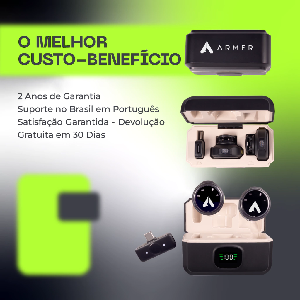 O ARMER ClipSense 2C é o microfone de lapela sem fio duplo ideal para criadores de conteúdo, jornalistas, professores, streaming de gamers, e influenciadores que desejam áudio cristalino, praticidade e liberdade total nos seus vídeos.