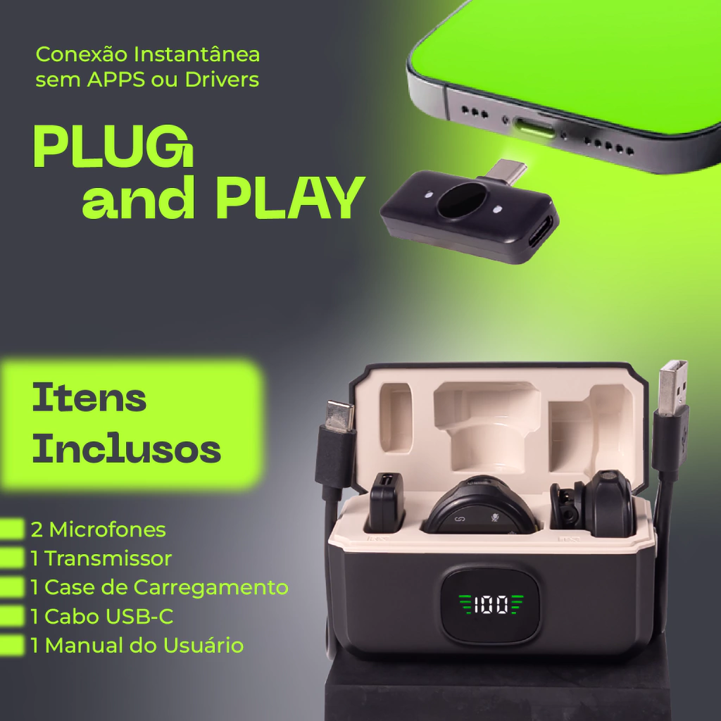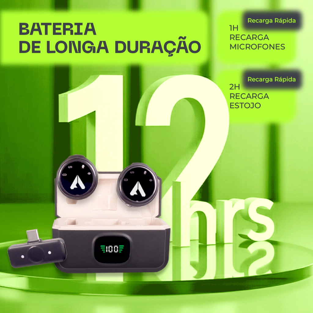 Recarga rápida de aproximadamente 1 hora para os microfones, e 2 horas para o estojo de carregamento ( O tempo pode variar dependendo da potência de cada carregador ).