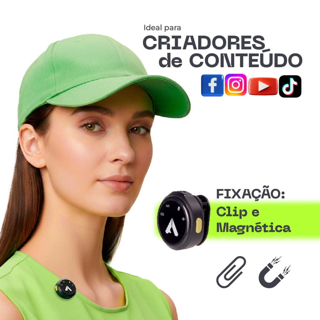 Fixação magnética ou clip, permitindo usar em roupas, Bonés, colares ou até superfícies metálicas.