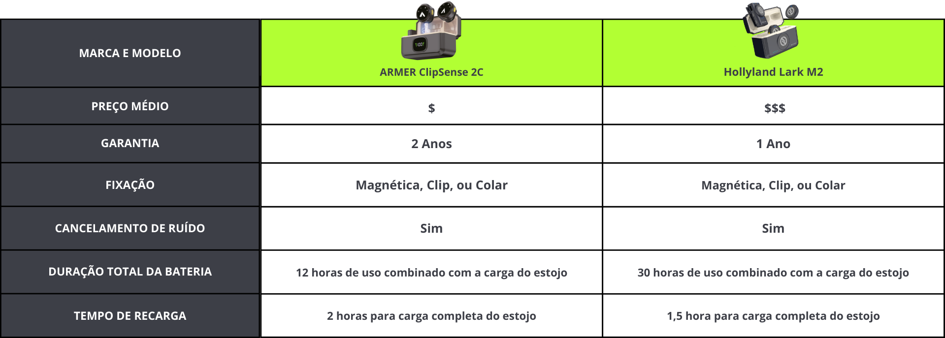 Bateria superendurance: até 4 horas por microfone, totalizando 12 horas de uso combinado com a carga do estojo.